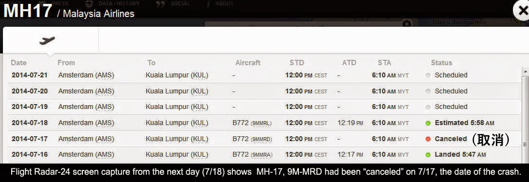 這是MH-17客機的雷達紀錄,顯示在事件發生那天雷達訊號被取消了。這或許表示飛機根本沒有起飛,或是飛行到一半就被中斷了?